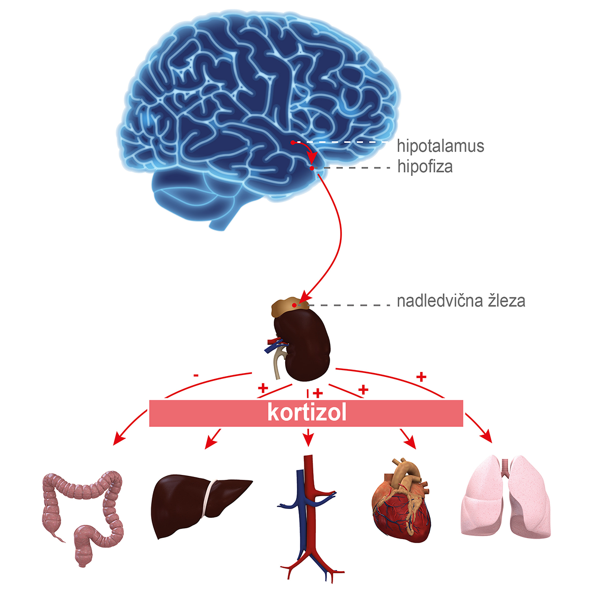 V hipotalamusu nastaja kortikoliberin, ki spodbuja sproščanje hormona kortikotropina v hipofizi, ta pa vpliva na sproščanje glukokortikoidov v nadledvičnih žlezah. Glukokortikoidi so steroidni hormoni, ki igrajo pomembno vlogo pri uravnavanju stresnega odziva; njihov glavni predstavnik je kortizol.