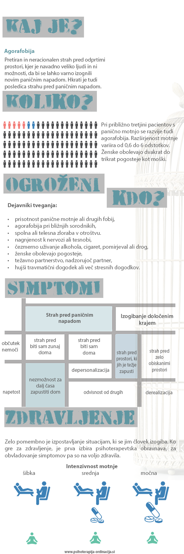 Pri agorafobiji torej ne gre zgolj za strah pred odprtimi prostori (starogrška beseda agora pomeni trg), pač pa tudi strah pred zapuščanjem doma, vstopanjem v javne prostore, strah pred množico, potovanjem z javnimi prevoznimi sredstvi …