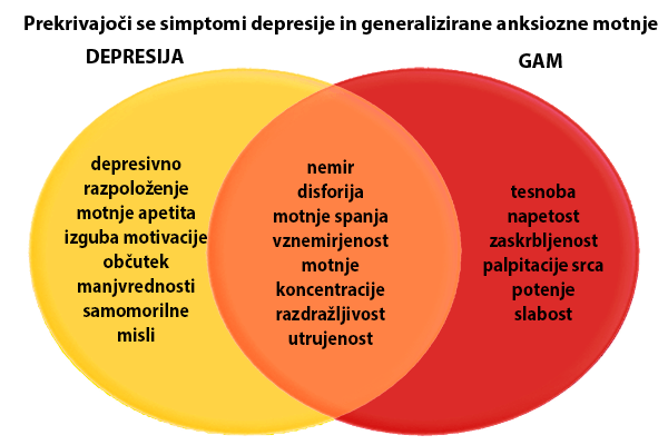 · zaskrbljenost in tesnoba sta povezani z najmanj tremi od naslednjih simptomov: nemir ali občutek živčnosti/napetosti, pretirana utrujenost, težave s koncentracijo, občutek praznine v glavi, razdražljivost, mišična napetost. motnje spanja,